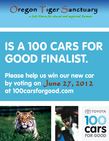 OTS Selected as Toyota 100 Cars for Good Finalist! The Oregon Tiger Sanctuary is proud to announce we’ve been selected as One of 500 Finalists in Toyota’s 100 Cars for Good Program. Now we need your support! Please Help us WIN a new truck to make an even bigger difference in the lives of the animals we rescue and give sanctuary to. Please Tell your friends and vote for the Oregon Tiger Sanctuary at www.100carsforgood.com on June 27, 2012. Toyota’s 100 Cars for Good program will be awarding 100 vehicles to 100 non-profits over the course of 100 days based on votes from the public. A total of 500 non-profits were selected from more than 4,000 applications nationwide. We Will use our new Toyota Tundra truck to retrieve thousands of pounds of frozen tiger meat we feed our big cats each week from our cold storage warehouse in town and also to deliver it around our compound to our big cats.